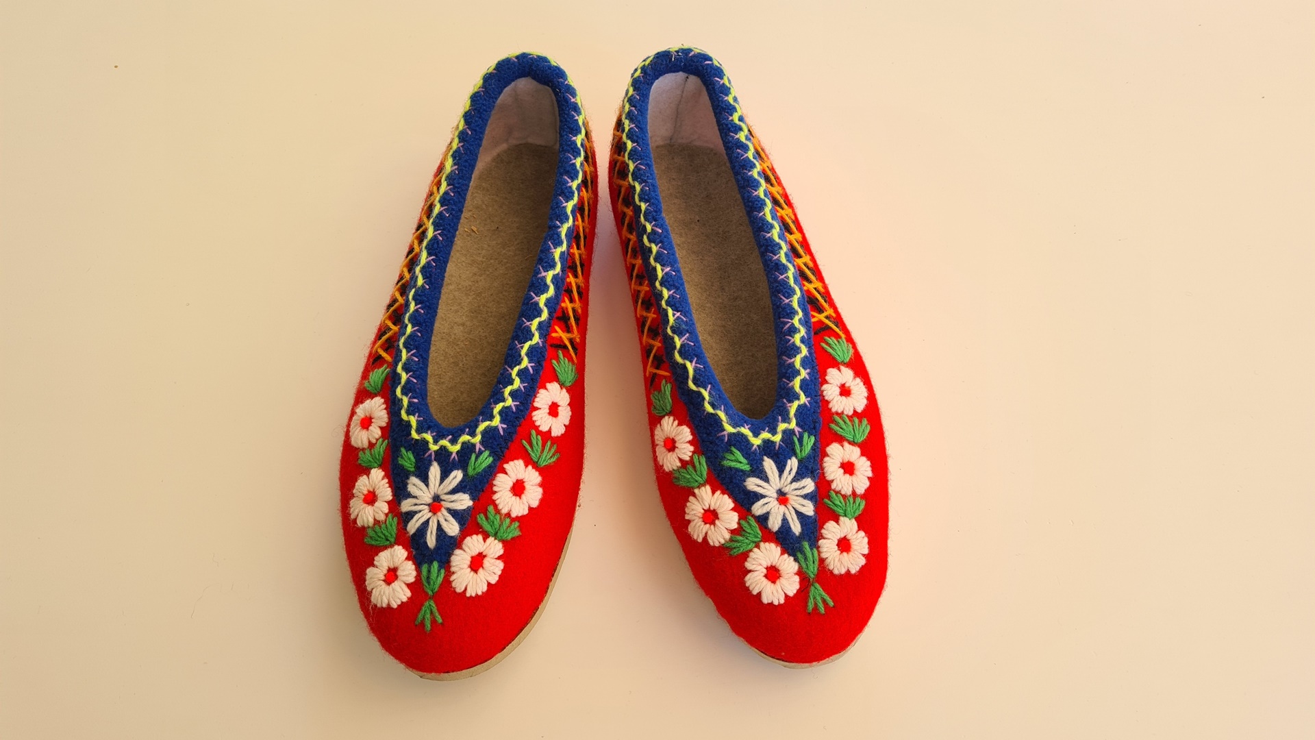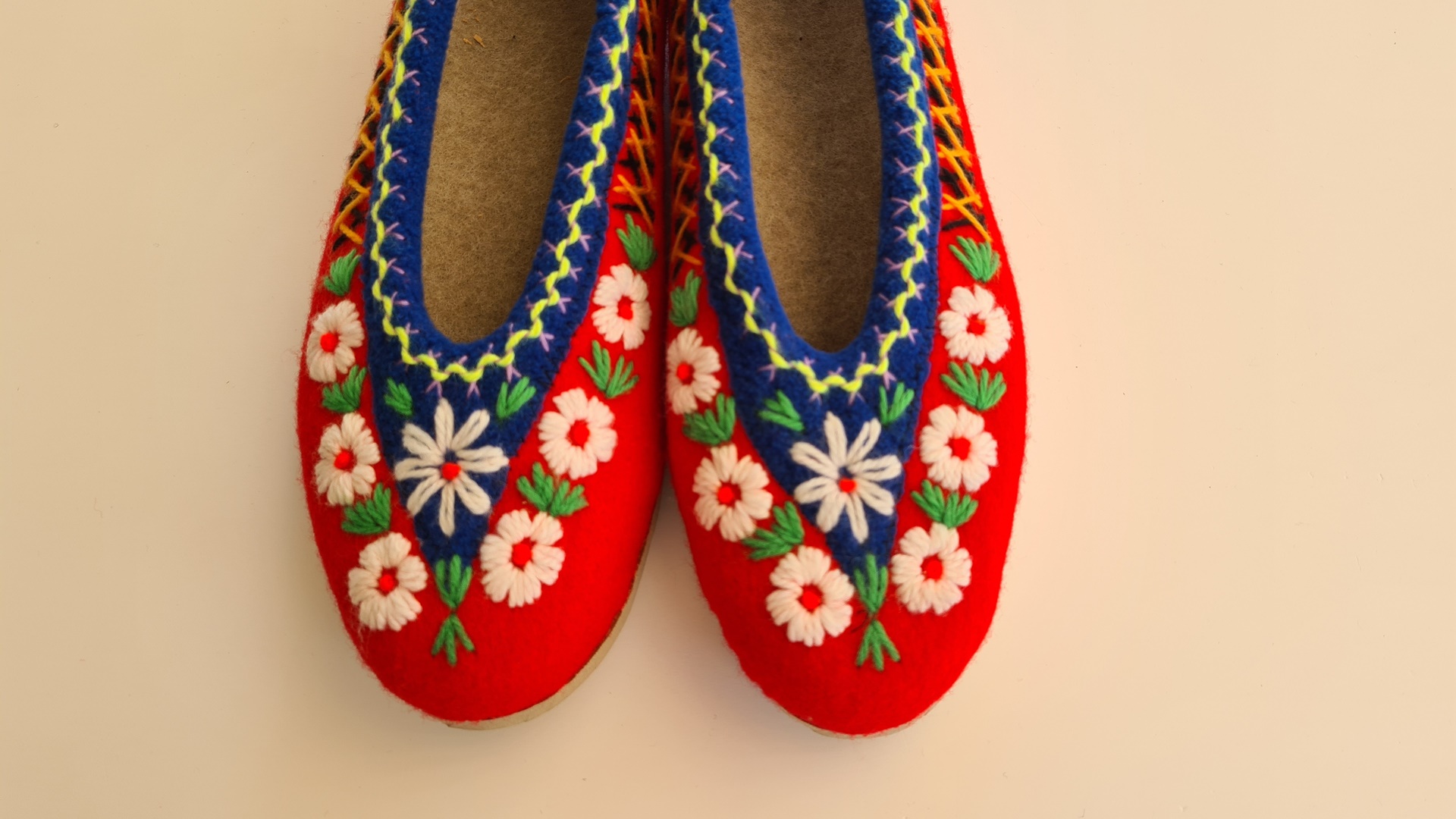 Kapcie/ pantofle domowe z filcu. Czerwono-granatowe z białymi stokrotkami. Ciepłe i trwałe, w całości wykonane ręcznie.