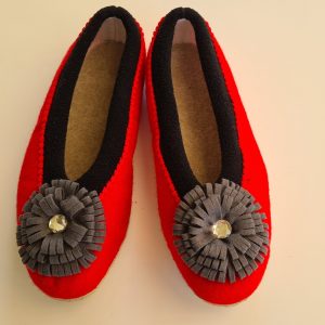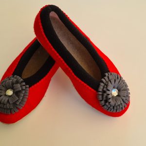 Kapcie/ pantofle domowe z filcu. Czerwono-szare z białymi stokrotkami. Ciepłe i trwałe, w całości wykonane ręcznie. Wykończone pięknym, ręcznym haftem. Wzór jest niepowtarzalny! Od spodu – odporna podeszwa gumowana. Można prać (nawet w pralce). Zrobione w Polsce / Handmade in Poland